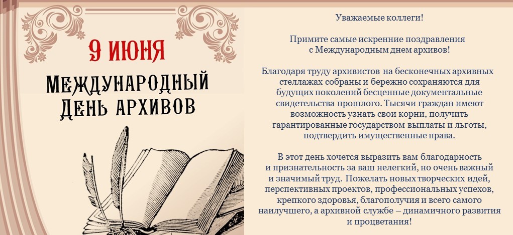 Ежегодно 9 июня отмечается Международный день архивов. В этот день в 1948 году под эгидой ЮНЕСКО был основан Международный совет архивов. Праздник был учрежден Международным советом архивов в ноябре 2007 года на Генеральной ассамблее в Квебеке (Канада).